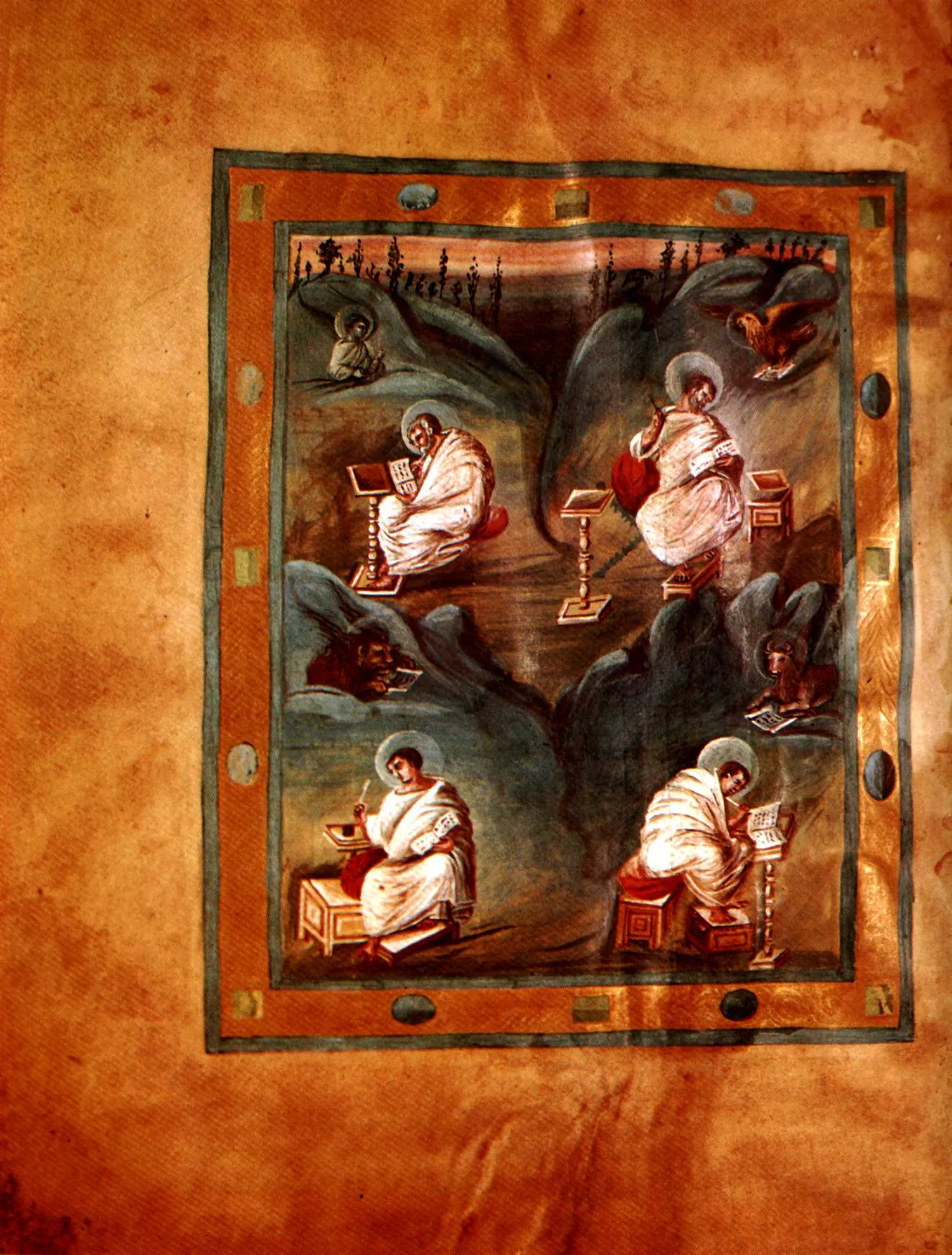 Manuscripts are the clearest place to see this ambition. In Carolingian Gospel books, evangelists are often placed in architectural settings, modeled by light and shadow, with drapery that suggests weight and bodily presence. The page breathes more than many earlier medieval pages. Frames, initials, and ornament still matter, but they are less likely to absorb the whole surface.